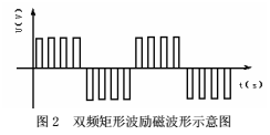 常規(guī)電磁流量計(jì)所應(yīng)用的低頻方波勵(lì)磁方式的勵(lì)磁電流頻率通常為工頻的1/4~1/10。目前深井(6000m以上)的固井施工中所使用泥漿的密度大多在1.8g/cm³以上,流速高達(dá)25m/s,所用的泥漿又是固液兩相低導(dǎo)率流體,雖然高壓下能消除非牛頓流體所帶來的測量誤差,但測量管內(nèi)會(huì)產(chǎn)生隨流量增加而頻率增加的隨機(jī)干擾噪聲。經(jīng)測定,在DN50測量管內(nèi),所用的泥漿密度為2.0g/cm³,流速在10~15m/s范圍內(nèi),測量管內(nèi)的流動(dòng)噪聲主要為尖峰狀的泥漿流噪聲,量級(jí)在mv級(jí),頻率集中在25Hz以下,如圖1所示。在勵(lì)磁頻率較低時(shí),泥漿干擾的數(shù)量級(jí)較大,高頻時(shí)干擾數(shù)量級(jí)較小,具有1/f的頻譜特性。另外,施工現(xiàn)場敲擊和震動(dòng)所帶來的低頻噪聲,也會(huì)影響電磁流量計(jì)的計(jì)量精度。提高勵(lì)磁電流頻率可以規(guī)避和抑止這些干擾,以提高電磁流量傳感器輸出的信噪比,但會(huì)犧牲電磁流量計(jì)的零點(diǎn)穩(wěn)定性。本文提出新的一種勵(lì)磁方式,采用雙頻矩形波作為勵(lì)磁信號(hào)。其勵(lì)磁電流波形是在低頻矩形波上疊加高頻矩形波,用兩種采樣頻率分別得到高頻和低頻兩種流量信號(hào)。如圖2所示,高頻部分是80Hz的矩形波,外包絡(luò)線是10Hz的低頻矩形波。這樣,能克服單一低頻矩形波勵(lì)磁存在的泥漿流動(dòng)噪聲,同時(shí)又能保證零點(diǎn)的穩(wěn)定性,提高流量計(jì)的計(jì)量穩(wěn)定性和響應(yīng)速度。