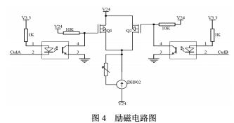 勵(lì)磁電路決定儀表的工作磁場,是儀表極其關(guān)鍵的部分。本文中的勵(lì)磁電路由兩部分組成,如圖4所示。由單片機(jī)MSP430F2418的定時(shí)器產(chǎn)生雙頻矩形波,經(jīng)光耦隔離后通過兩片場效應(yīng)管組成的開關(guān)電路實(shí)現(xiàn)通斷功能。DH902為恒流管,提供恒定的勵(lì)磁電流,由MCU定時(shí)器脈沖寬度調(diào)制(PWM)輸出經(jīng)過濾波后控制勵(lì)磁電流的幅值,從而產(chǎn)生雙頻矩形波。