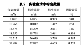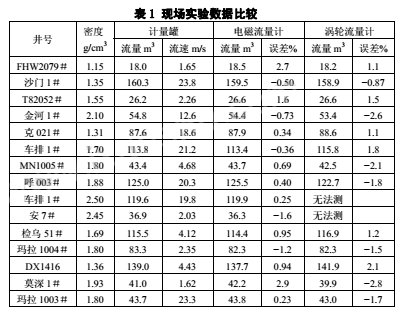 現(xiàn)場試驗(yàn)所用測量管的內(nèi)徑為DN50,通過高壓由壬接入泥漿管線,并串接渦輪流量計(jì)進(jìn)行比較,采用標(biāo)準(zhǔn)計(jì)量罐測試。計(jì)量鉆井泥漿密度范圍為1.15g/cm³~2.50g/cm³,固井設(shè)計(jì)施工現(xiàn)場一次性替漿量為18m³~160m³,替漿瞬時(shí)流量為0.2m³/min~2.8m³/min(流速:1.6~23.8m/s);通過近15口井的施工應(yīng)用,結(jié)果如表1所示。試驗(yàn)表明儀表計(jì)量誤差小于1%;在流速2.0m/s以下,隨著流量的減少測試誤差逐漸提高,在流速1.0m/s左右計(jì)量精度降到3%左右。經(jīng)分析,主要是由零點(diǎn)漂移引起的,這點(diǎn)與實(shí)驗(yàn)室用清水標(biāo)定結(jié)果基本吻合。使用DN50的測量管,實(shí)驗(yàn)室標(biāo)定結(jié)果如表2所示。試驗(yàn)證明,采用雙頻矩形波作為勵(lì)磁信號(hào),可有效地規(guī)避和抑止固井泥漿的流動(dòng)噪聲和現(xiàn)場震動(dòng)等所帶來的低頻噪聲,從而顯著提高儀表計(jì)量泥漿的精度。