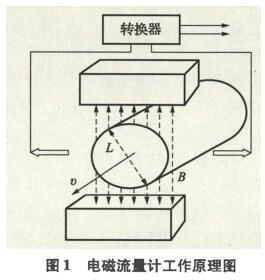 污水處理廠流量計(jì)是利用法拉*電磁感應(yīng)定律測(cè)量,如圖1所示,用于測(cè)量電極與運(yùn)動(dòng)的流體構(gòu)成的回路中產(chǎn)生的電參數(shù),并根據(jù)公式換算成流體速度,再測(cè)量流通截面液位高度得到流通面積,兩者相乘得到所測(cè)流量。