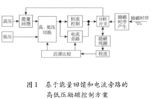 基于能量回饋和電流旁路的高低壓勵(lì)磁控制方案框圖如圖1所示,主要由高、低壓電源、能量回饋電路、高、低壓切換電路、恒流控制電路、電流旁路電路、H橋開(kāi)關(guān)電路、檢流電路和勵(lì)磁時(shí)序產(chǎn)生電路組成。