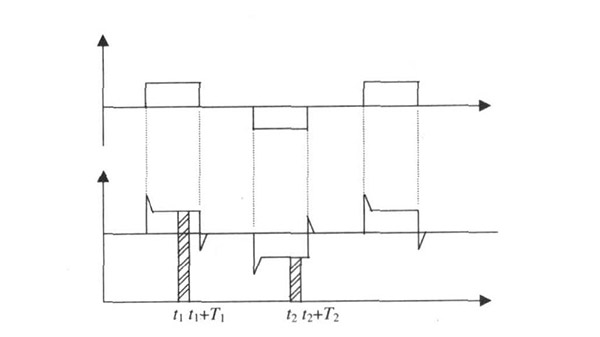 污水管道流量計(jì)一般都采用工頻交流電源供電, 其電源電壓的幅值和頻率的變化都會給污水管道流量計(jì)帶來電源性干擾噪聲。對電源電壓的幅值變化, 因采用多級集成穩(wěn)壓, 一般而言電源電壓的幅值變化對電磁流量的測量精度影響不大。當(dāng)電源電壓的頻率波動時(shí), 雖然其波動范圍有限, 但對污水管道流量計(jì)測量精度影響較大。為了解決工頻干擾問題, 實(shí)現(xiàn)對流體流速感應(yīng)電勢eab信號的準(zhǔn)確測量, 需利用以下基本關(guān)系:①勵磁周期為工頻周期的整數(shù)倍, 即勵磁頻率為50/nHz(n為偶數(shù));②正負(fù)勵磁下的同相位采樣。圖2是對應(yīng)低頻矩形波勵磁形式下的典型電勢信號形式, 按上述關(guān)系在一個(gè)勵磁周期下, 若假設(shè)t1 和t2 點(diǎn)為工頻干擾的等效干擾點(diǎn), 且采樣寬度T=T1 =T2 , 則eab的基本算式為: