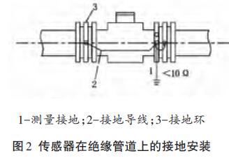 傳感器安裝在塑料管道或內(nèi)壁有絕緣涂層、襯里的管道上,兩端應(yīng)安裝接地環(huán)(或帶有接地電極的金屬短管),然后用導(dǎo)線連接,使管內(nèi)流動(dòng)的介質(zhì)與大地短路,具有零電位(見(jiàn)圖2)。
