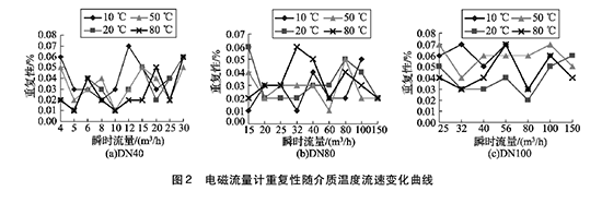 將實驗測得的管道污水處理進(jìn)出水口流量計在不同溫度及流速下的重復(fù)性數(shù)據(jù)整理,特性曲線如圖2所示,3組曲線分別對應(yīng)DN40, DN80, DN100的3塊管道污水處理進(jìn)出水口流量計的重復(fù)性曲線。