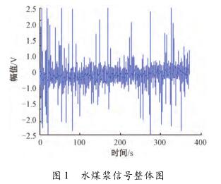 針對硅酸鈉流量計測量水煤漿時出現(xiàn)較大波動,甚至回零這一問題,特去某煤化工企業(yè)甲醇分公司進(jìn)行現(xiàn)場數(shù)據(jù)采集。該公司所使用的對置式四噴嘴氣化有4個噴嘴,噴嘴管道口徑為125mm,管中水煤漿流量基本穩(wěn)定在19m³/h(流速約為0.48m/s)。每條噴嘴煤漿線上安裝了3臺硅酸鈉流量計,每臺硅酸鈉流量計由傳感器和變送器兩部分組成。選擇其中1條水煤漿管線上的1臺硅酸鈉流量計進(jìn)行數(shù)據(jù)采集,因為該臺硅酸鈉流量計測量結(jié)果波動大,甚至出現(xiàn)回零的現(xiàn)象。將課題組研制的基于DSP的電磁流量變送器的信號線和勵磁線接到該電磁流量傳感器的電極和勵磁線圈上,組合成完整的硅酸鈉流量計,進(jìn)行水煤漿數(shù)據(jù)采集。使用的電磁流量變送器是以TI公司DSP芯片TMS320F28335為核心,采用高頻勵磁方案,其硬件主要包括勵磁控制系統(tǒng)和信號采集處理系統(tǒng),具體的模塊有勵磁驅(qū)動模塊、信號調(diào)理采集模塊、信號處理控制模塊、人機(jī)接口模塊、通信模塊及電源管理模塊。信號調(diào)理采集模塊中的調(diào)理電路對一次儀表輸出的信號進(jìn)行放大和濾波,截止頻率是2kHz,放大倍數(shù)約為230倍。通過NI公司USB-6216型號的數(shù)據(jù)采集卡進(jìn)行數(shù)據(jù)采集,把調(diào)理電路的輸出端連接到數(shù)據(jù)采集卡的一個差分輸入端,并設(shè)置數(shù)據(jù)采集卡工作在差分的測量模式,設(shè)置采集卡的采樣頻率為10kHz。采集多組水煤漿信號數(shù)據(jù),每組數(shù)據(jù)的時間長度為5min。