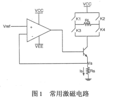 以往的激磁電路的設(shè)計都是采用恒流源和可控開關(guān)電路組成。恒流源是由電壓基準(zhǔn)、比較放大、控制調(diào)整和采樣等部分組成的直流負(fù)反饋?zhàn)詣诱{(diào)節(jié)系統(tǒng),常用的激磁電路就是用串聯(lián)調(diào)整型恒流電源盒控制開關(guān)組成的,如圖1。其中Vref是參考電壓,Rs是采樣電阻,Is為流過Rs的電流,就是所需的恒流,RL為電磁流量傳感器線圈,K1、K2、K3、K4為可控開關(guān),以達(dá)到使線圈RL中流經(jīng)正負(fù)交換的電流,對傳感器激磁。