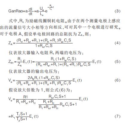 提出在硬件電路上加入模擬開關(guān), 干擾尖峰到來時斷開模擬開關(guān)避免干擾進入后級電路,尖峰過去重新打開模擬開關(guān);K.Saito 等提出漂移校正法,先以高勵磁頻率進行勵磁,在勵磁過程中插入低勵磁頻率提取用于漂移校正的非固定微分噪聲分量,但在插入的低勵磁頻率段漿液噪聲較大且很難將漿液噪聲與流量信號分離,此時的校正因子非單純的非固定噪聲分量,改進措施是長時間取平均值得到穩(wěn)定因子。 傳統(tǒng)方法是同步采樣保持法,即在磁場穩(wěn)定階段采樣。 其他消除干擾的方法有設(shè)置干擾補償機構(gòu)、控制勵磁電流變化率減小干擾幅值、矩形波代替梯形波、希爾伯特黃變換結(jié)合傅里葉變換和程控增益技術(shù)等。經(jīng)上述對現(xiàn)有的文獻(xiàn)分析與總結(jié)可知, 當(dāng)前消除微分噪聲主要從信號處理方面入手,并未對影響噪聲的因素加以研究。 本文建立電極測量回路等效模型,給出仿真模型搭建、參數(shù)取值和仿真結(jié)果分析。