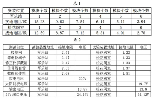 接地網(wǎng)的安裝與連接:接地網(wǎng)是整個(gè)重油流量計(jì)防雷試驗(yàn)比較關(guān)鍵的一個(gè)內(nèi)容,能不能準(zhǔn)確的論證試驗(yàn)的有效性,必須保證接地網(wǎng)達(dá)到標(biāo)準(zhǔn)的接地電阻,通過(guò)對(duì)實(shí)地地電阻率的測(cè)試,初步選擇6個(gè)接地模塊埋設(shè)并配用降阻劑使用,邊安裝邊測(cè)試直到達(dá)到標(biāo)準(zhǔn)值后才引入等電位箱。在軍樂(lè)站和松花閥室安裝模塊并測(cè)試數(shù)據(jù)見(jiàn)表1。