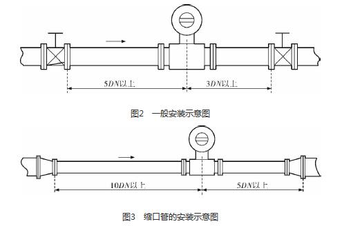 油田污水流量計(jì)廠家的安裝質(zhì)量對其測量結(jié)果的影響較大,因此在安裝時(shí)需要注意幾個(gè)問題。*先,油田污水流量計(jì)廠家直管段的選擇在配管時(shí)一定要按照要求進(jìn)行選擇,一般選擇流量計(jì)通徑與工藝管道通徑相同,即可滿足工程需要,而且安裝方便、壓力損失小,流量計(jì)直管段上游側(cè)的長度不少于5倍工藝管道直徑,下游側(cè)的長度不少于3倍工藝管道直徑(圖2)。但在流速太慢而又要求精度較高或需要變徑的應(yīng)用場合,可選擇通徑小于工藝管道通徑的流量計(jì),以提高測量精度,此時(shí)流量計(jì)上、下游必須加裝異徑管,且進(jìn)口異徑管上游側(cè)應(yīng)有長于10倍工藝管道直徑的直管段,下游側(cè)應(yīng)有長于5倍工藝管道直徑的直管段(圖3)。