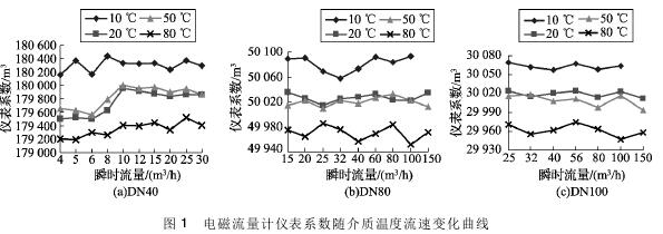 將實驗測得的dn150深井水流量計在不同溫度及流速下的儀表系數(shù)數(shù)據(jù)整理,特性曲線如圖1所示,3組曲線分別對應(yīng)DN40、DN80、DN100的3塊dn150深井水流量計的儀表系數(shù)曲線。