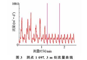 T-××-××1井是大慶油田采油五廠1口水驅(qū)產(chǎn)出井,采用阻抗式含水率計(jì)在該井進(jìn)行了測(cè)試。圖3、圖4分別為測(cè)點(diǎn)深度1097.3m測(cè)量的流量及混相值曲線圖。2min的采樣時(shí)間內(nèi),流量及混相值曲線波動(dòng)劇烈,明顯受井下產(chǎn)氣影響,進(jìn)行平均值計(jì)算時(shí)只能取后半段較平穩(wěn)的數(shù)據(jù),因此,測(cè)試時(shí)需延長(zhǎng)測(cè)量時(shí)間。錄取不同范圍數(shù)值時(shí)流量及含水率測(cè)量差值較大,流量平穩(wěn)段為14.81m3/d,高值時(shí)達(dá)到23.52m3/d;取不同測(cè)量段的混相值時(shí)測(cè)量含水率*大相差12%。重復(fù)測(cè)量得到了相同的測(cè)量結(jié)果。由此可見(jiàn),氣體對(duì)流量及含水率測(cè)量產(chǎn)生了非常大的測(cè)量誤差。