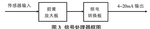 信號處理器對渦街流量傳感器產(chǎn)生的頻率信號經(jīng)過濾波、放大、頻電轉(zhuǎn)換等幾個環(huán)節(jié)處理,*終將頻率信號轉(zhuǎn)換為標(biāo)準(zhǔn)4~20mA信號輸出。信號處理器框圖如圖3所示。