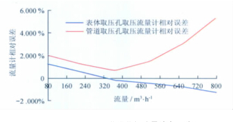 從以上數(shù)據(jù)表和曲線圖中可以看出:空氣流量計(jì)型號(hào)一定的情況下,用表體取壓孔取壓方式檢定流量計(jì)時(shí)流量計(jì)的線性度較好,用管道取壓孔取壓方式檢定流量計(jì)時(shí)流量計(jì)的線性度較差;流量測(cè)點(diǎn)相同的情況下,表體取壓孔取壓檢定方式的流量計(jì)誤差較小,管道取壓孔取壓檢定方式的流量計(jì)誤差較大;兩種取壓方式引起的誤差隨著流量的增大而逐漸增大,在流量為2?。梗埃埃恚常钑r(shí)兩者相差近6.2%,遠(yuǎn)遠(yuǎn)超出了流量計(jì)的準(zhǔn)確度等級(jí)。所以,在空氣流量計(jì)的檢定過程中,應(yīng)避免在流量計(jì)表體取壓孔以外的地方取壓進(jìn)行檢定。