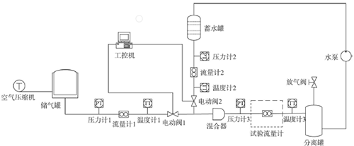 空氣壓縮機將空氣壓縮后送入儲氣罐,標(biāo)準流量計1計量氣液混合前儲氣罐送入管道的氣體流量。蓄水罐距離地面30m,提供試驗所需的液相,其流量由標(biāo)準流量計2測得。液相和氣相經(jīng)混和器混和后送入試驗管段,*后流入分離罐將水和空氣進行分離,空氣由放氣閥排出,水由水泵送回蓄水罐循環(huán)使用。工控機對所有儀表數(shù)據(jù)進行采集和顯示并對兩個電動調(diào)節(jié)閥進行控制,調(diào)節(jié)氣相和液相的流量。