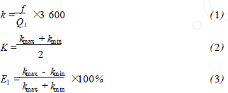 乙烯流量計在標(biāo)準水裝置上,分別用頻譜分析和脈沖計數(shù)的方法進行標(biāo)定,流體介質(zhì)為水未加氣體,采用的標(biāo)準傳感器為精度等級為0.2級的電磁流量計。在每個流量測量點上的儀表系數(shù)用公式(1)計算,然后用式(2)計算得到*終儀表系數(shù)K。Ql為被測水的流量值,f為每一個流量點得到的頻率,k為每個測量點得到的儀表系數(shù)。kmax、kmin分別為試驗流量范圍內(nèi)得到的*大與*小的儀表系數(shù)。儀表系數(shù)的線性度E1用式(3)來計算。