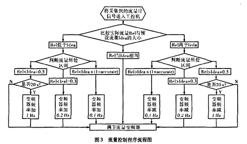 實際生產(chǎn)中流量一直在某個區(qū)域內(nèi)波動,且其動態(tài)特性不易掌握。從上面的理論中我們能夠讓誤差△£盡可能的小,這樣距我們所需要的理論值%就越接近。而減小誤差需要我們把n取的盡可能大,也就是在生產(chǎn)時間內(nèi)劃分更多的周期去調(diào)節(jié)流量。當(dāng)工控機(jī)根據(jù)一體化污水流量計傳送回來的信號發(fā)出調(diào)節(jié)變頻器工作頻率的指令后,電機(jī)調(diào)整功率到一體化污水流量計的實際測量為一個工作周期,我們知道從指令發(fā)送到實際測量值返回有一個較大的滯后,如果調(diào)節(jié)的周期時間小于流量計本身的一個工作周期,那么顯然不可能達(dá)到減小誤差的目的。利用模糊控制思想H。,在控制程序中我們把流量的波動區(qū)域劃分為±缸×Yo,Yo-t-O.3,Yo±0.5四個區(qū)域,其中缸為可調(diào)節(jié)的誤差范圍,生產(chǎn)中我們?nèi)?.015,流量區(qū)域劃分的單位均為t/h。針對不同的區(qū)域采取不同的調(diào)整方案。具體流程如圖3所示。圖中變量Rel表示實際測量的流量,變量Idea表示理論流量。