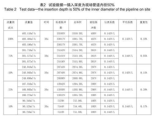插入式煙氣流量計插入深度為現(xiàn)場管道內(nèi)徑的50%時,試驗數(shù)據(jù)如下(以 DN200 為例):