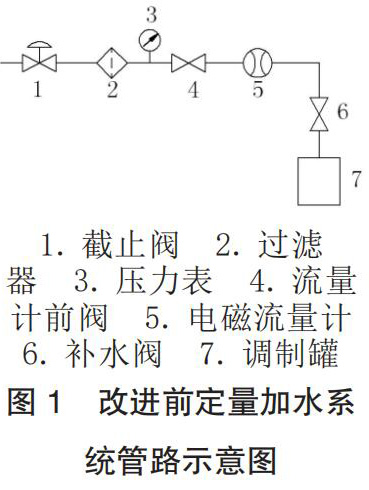 工廠的香料廚房系統(tǒng)為國內(nèi)煙機公司 2004 年設(shè)計制造,其定量加水系統(tǒng)主要由水源、生活污水流量計、加水管路元件和控制程序這四部分組成,改進前管路示意圖如圖 1 所示。