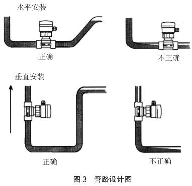 現(xiàn)場(chǎng)安裝時(shí)應(yīng)注意遠(yuǎn)離可能對(duì)其產(chǎn)生干擾的大型設(shè)備,防止長(zhǎng)期的熱輻射和其他如磁場(chǎng)直射等環(huán)境影響。為確保高測(cè)量精度和較好的零點(diǎn)穩(wěn)定性,進(jìn)行校正前,高壓電磁流量計(jì)應(yīng)裝入工藝介質(zhì)中至少 24 小時(shí)電極鈍化。安裝的管路設(shè)計(jì)應(yīng)確保管道始終充滿(mǎn)流體,防止測(cè)量誤差,管路設(shè)計(jì)圖見(jiàn)圖 3。