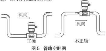 測(cè)量流向取決于高壓電磁流量計(jì)的安裝方位,將高壓電磁流量計(jì)在接頭上旋轉(zhuǎn) 180 度即可反向。正流向時(shí),高壓電磁流量計(jì)的突耳應(yīng)在上游方向。流量顯示總是正的,而累加器可以根據(jù)流向增加或者減少。安裝中確認(rèn)管路設(shè)計(jì)不允許在介質(zhì)中產(chǎn)生氣泡或空腔,否則將引起測(cè)量誤差(見(jiàn)圖 5)。