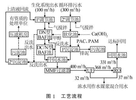 2種廢水在中間水池混勻后,通過(guò)泵提升進(jìn)入保安過(guò)濾器,進(jìn)一步去除細(xì)小的懸浮物后經(jīng)過(guò)增壓泵進(jìn)入超濾膜(UF)處理系統(tǒng)和反滲透(RO)系統(tǒng),然后通過(guò)管道式電磁流量計(jì)進(jìn)行計(jì)量。反滲透出水直接進(jìn)入回用水池達(dá)標(biāo)回用,超濾濃水以及反滲透濃水用作水煤漿混合用水。污泥池中的污泥通過(guò)泵打入帶式機(jī)壓濾處理,濾液自流進(jìn)入1#調(diào)節(jié)池。工藝流程見(jiàn)圖1。