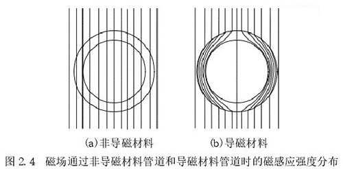 1.測量管:主要是傳感器的管道,該管道由高導電率非導磁材料制成,可保證流體在通過時能夠表現(xiàn)出自身的電磁效應,在該管道內(nèi)中安裝了內(nèi)襯。使用非導磁材料的原因是保證勵磁線圈中所產(chǎn)生的磁場不會順著管道流走,確保測量管道內(nèi)部產(chǎn)生明顯的磁感應線,下圖 2.4 中展示了利用非導磁材料和導磁材料管道中所產(chǎn)生磁感應線的情況。