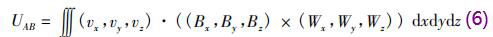 式中j→為電流密度矢量,為通過液體單位面積的電流,A/m2;E→為電場強度矢量,V/m;v→為流體速度,m/s;B→為磁感應(yīng)強度,T。當(dāng)激勵電流角頻率ω不大時,流體中的位移電流完全可以忽略,即