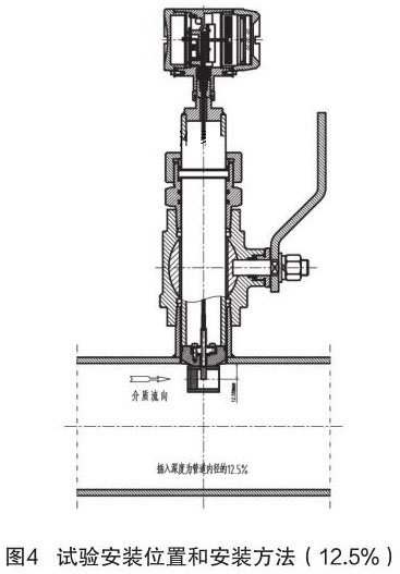 根據(jù)中華人民共和國機械行業(yè)標準:JB/T9249-2015《壓縮空氣流量計》進行插入式壓縮空氣流量計的研制與設(shè)計。在試驗過程中,因為理論研究不充分,再加上經(jīng)驗不足,采用插入深度是按照以往其它產(chǎn)品(插入式電磁流量計)的經(jīng)驗,以插入深度為現(xiàn)場管道內(nèi)徑的 12.5% 進行試驗,其對介質(zhì)流量的檢測值與同種規(guī)格管道法蘭式結(jié)構(gòu)的壓縮空氣流量計進行比較,偏差值較大、儀表準確度無法滿足設(shè)計要求。試驗安裝位置和安裝方法如圖 4 所示。