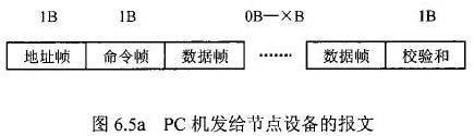在測(cè)水流量計(jì)等節(jié)點(diǎn)設(shè)備和C機(jī)通信的過(guò)程中,由地址幀、命令幀、數(shù)據(jù)幀、校驗(yàn)和可組成各種功能不同的報(bào)文。由于采用主從工作方式來(lái)實(shí)現(xiàn)通信,測(cè)水流量計(jì)等節(jié)點(diǎn)設(shè)備僅能接收并執(zhí)行PC機(jī)發(fā)送來(lái)的控制命令,而不能發(fā)送命令給PC機(jī)。因此,由PC機(jī)發(fā)往流量計(jì)等節(jié)點(diǎn)設(shè)備的報(bào)文一般包括一個(gè)地址幀,一個(gè)命令幀,若干個(gè)數(shù)據(jù)幀和一個(gè)校驗(yàn)和,其報(bào)文格式圖.6a5所示;而由流量計(jì)等節(jié)點(diǎn)設(shè)備發(fā)往PC機(jī)的報(bào)文一般包括一個(gè)地址幀,若干個(gè)數(shù)據(jù)幀和一個(gè)校驗(yàn)和,其報(bào)文格式如圖6.5b所示。