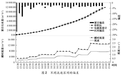 圖 2 的結(jié)果顯示,容積法校驗(yàn)電磁流量計(jì)累計(jì)偏差開(kāi)始階段不穩(wěn)定,后期趨于穩(wěn)定,在 -3. 0%附近。這是測(cè)量中不可避免存在某幾個(gè)時(shí)刻(特別出廠水流量改變時(shí))某些測(cè)量點(diǎn)液位波動(dòng)較大,導(dǎo)致記錄數(shù)值與真實(shí)情況存有較大差異,一開(kāi)始累計(jì)出水總量較少,偏差會(huì)相對(duì)放大,在后期累計(jì)水量大,這一原因?qū)е碌钠顪p少,偏差值也趨于穩(wěn)定。