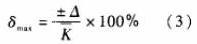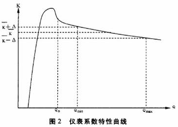 圖2顯示測量出電脈沖信號頻率F用平均儀表系數(shù)`K計算得到的Q值,在Qmin~Qmax范圍內(nèi)的*大相對誤差為: