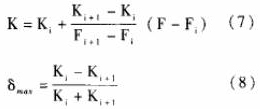 輪流量傳感器的儀表系數(shù)K與Q的關(guān)系近似線性的單調(diào)函數(shù)(見圖2)。因此,在對檢定結(jié)果進行處理時,直接將各檢定點的檢定結(jié)果以Fi、Ki的形式存入二甲苯流量計的數(shù)值運算部分,不必對其儀表系數(shù)取平均值。在使用渦輪流量傳感器進行流量測量時,根據(jù)渦輪流量傳感器的信號頻率F,即可在以上檢定結(jié)果中檢索各F,值,找出滿足F,≤F≤F的Fi、Fi+1(i=1,2,.,.n-1),n是該渦輪流量傳感器的流量檢定點數(shù);若信號頻率F=Fi或F=Fi+1,則相應(yīng)的Ki或K.i+1即為所需的儀表系數(shù);若信號頻率Fi