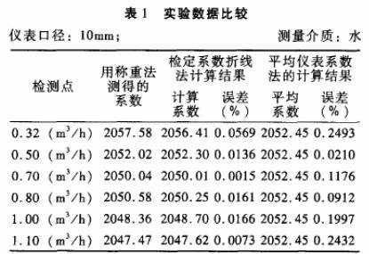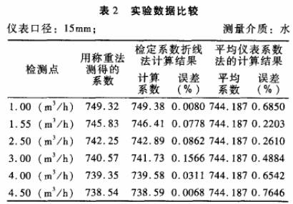 被檢儀表:公稱通徑分別為10mm和15mm的渦輪流量傳感器各一臺;檢定裝置:靜態(tài)稱重法標(biāo)準(zhǔn)水流量檢定裝置,系統(tǒng)精度+0.2%。分別采用常規(guī)的平均儀表系數(shù)法和檢定系數(shù)折線法進行標(biāo).定,并與作為標(biāo)準(zhǔn)的靜態(tài)稱重法的檢定結(jié)果進行比對,結(jié)果見表1.表2。