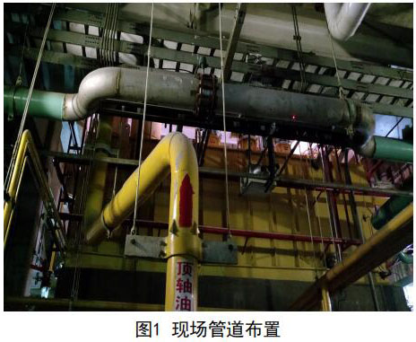 考慮兩臺機(jī)組管線布置和運行狀態(tài)完全一致, 下面僅提供#1機(jī)組的測量分析。圖1中頂軸油管上 部水平管道為凝結(jié)水補水管道。