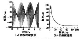 當(dāng)ω1-ω2趨近于0時(shí),即兩個(gè)信號(hào)的頻率越接近時(shí),拍振幅值越大。拍振信號(hào)的時(shí)域波形及頻譜圖如下,在頻譜圖中可看到兩個(gè)頻率接近的峰。