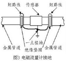 (4)盡量避開振動源、磁源(大功率電機、變壓器)由于dn200電磁流量計的測量感應(yīng)電壓很小,電壓較低,易受外界電磁噪聲的影響,故在安裝時應(yīng)進行可靠的接地連(跨)接。金屬管道dn200電磁流量計接地連(跨)接方法如圖3所示
