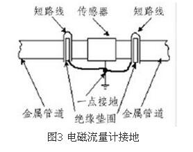 由于一體式污水流量計價格的測量感應(yīng)電壓很小,電壓較低,易受外界電磁噪聲的影響,故在安裝時應(yīng)進(jìn)行可靠的接地連(跨)接。金屬管道一體式污水流量計價格接地連(跨)接方法如圖3所示。